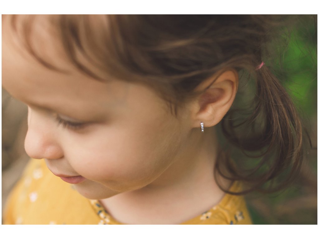 Dětské náušnice kroužky jsou vyrobeny z bílého zlata s bílými a světle modrými zirkonovými kamínky. Zlaté náušnice jsou opatřeny puncovní značkou 585/1000 od státního puncovního úřadu. Tyto náušnice jsou vhodné pro každodenní nošení a podtrhnou jemnou dětskou tvář. Rozměry výrobku jsou detailně zobrazeny v produktové doplňující fotografii. Náušnice pro Vás vyrábíme ručně za použití tradičních metod. Náušnice Vám dopravíme v originální krabičce.