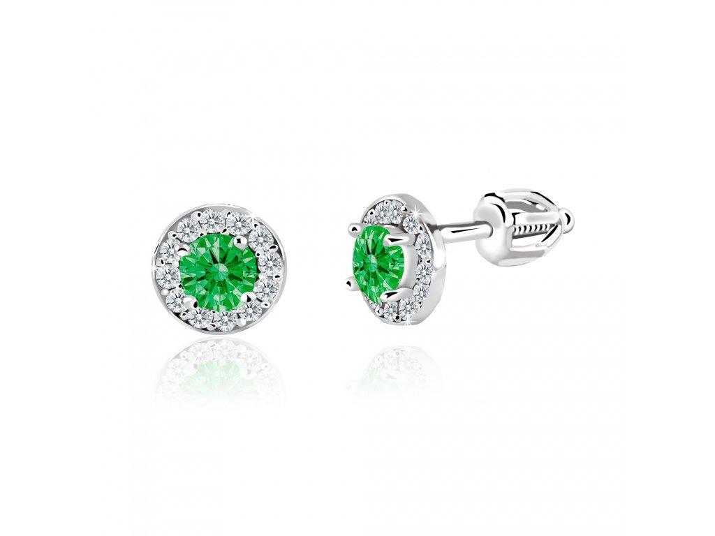 Kulaté náušnice EM 32039 z bílého zlata se zelenými kamínky uprostřed a bílými okolo, zapínání balónek