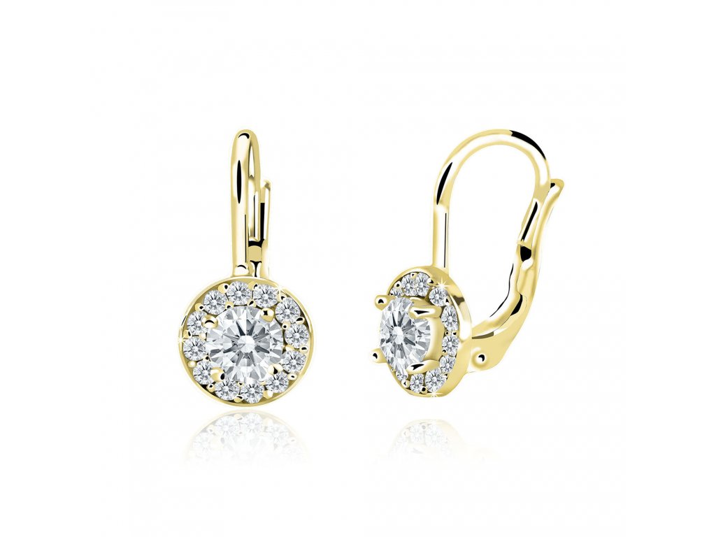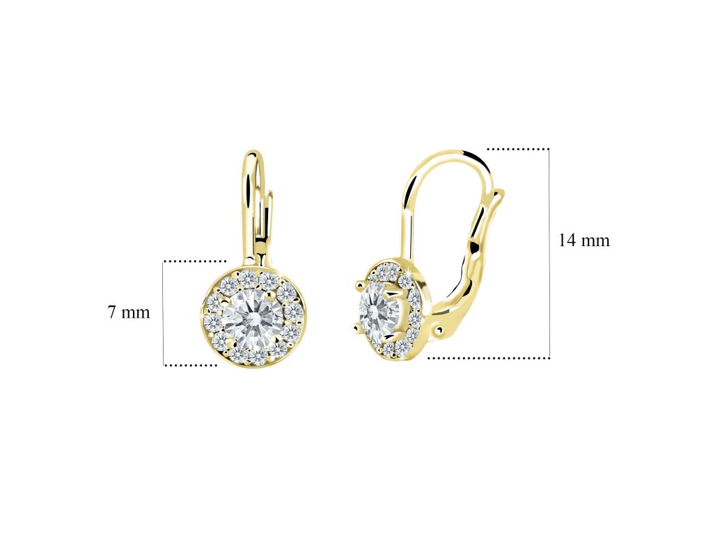 Dívčí náušničky se zapínáním na klapku jsou vyrobeny ze žlutého zlata s bílými zirkonovými kamínky. Zlaté náušnice jsou opatřeny puncovní značkou 585/1000 od státního puncovního úřadu. Tento typ zapínání je nejlepším výběrem pro holčičky, které už odrostly miminkovským náušničkám. Rozměry výrobku jsou detailně zobrazeny v produktové doplňující fotografii. Náušnice pro Vás vyrábíme ručně za použití tradičních metod. Náušnice Vám dopravíme v originální krabičce.